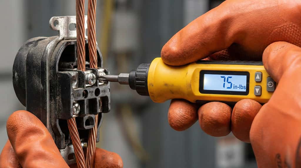 2. Litlhoko tsa Torque (NEC 110.14(D)):"Ho tiisa letsoho" ha hoa lekana. U tlameha ho sebelisa sesebelisoa sa torque e lekantsoeng ho fihlela torque e boletsoeng ke moetsi (ka tloaelo 75 in-lbs).